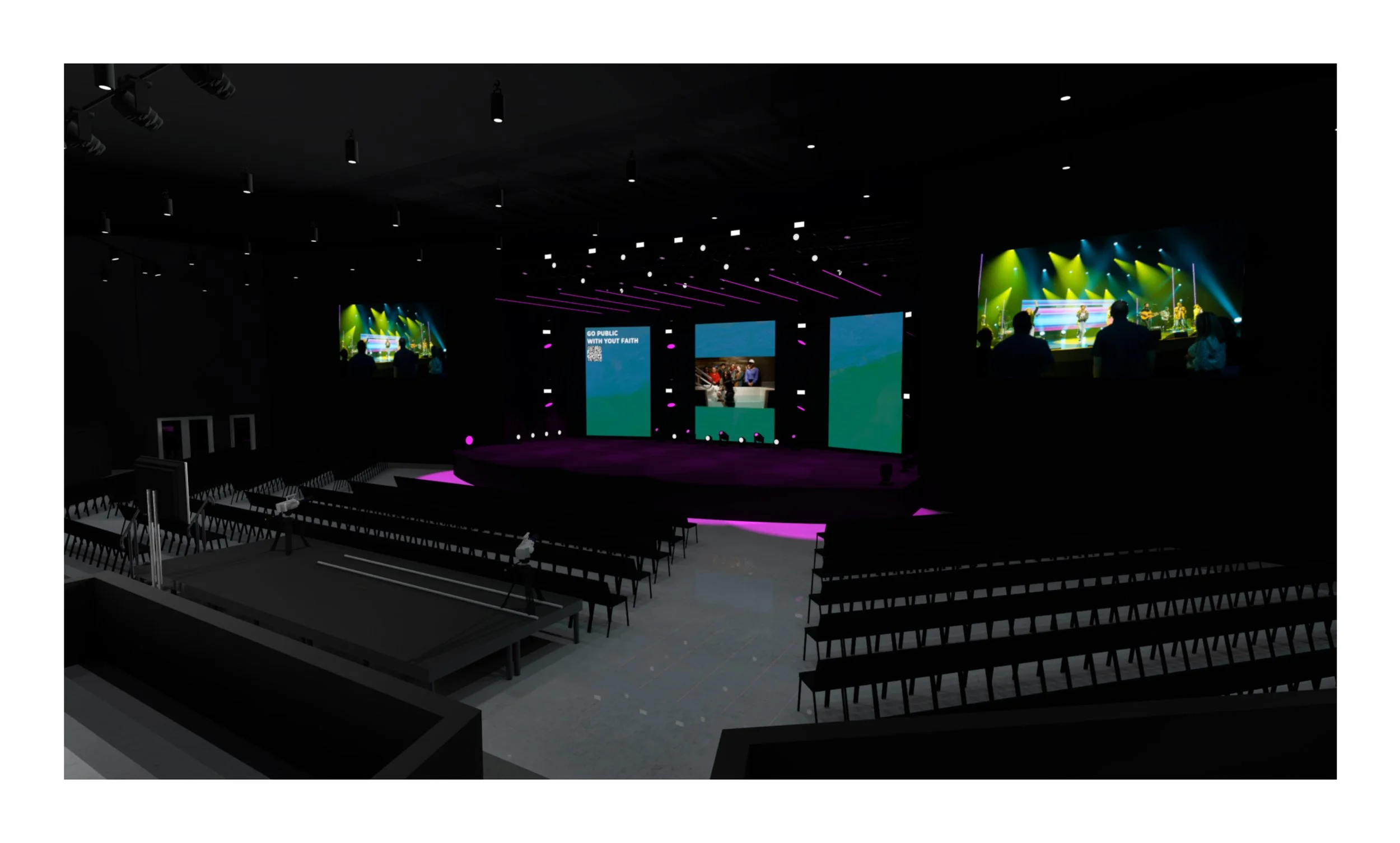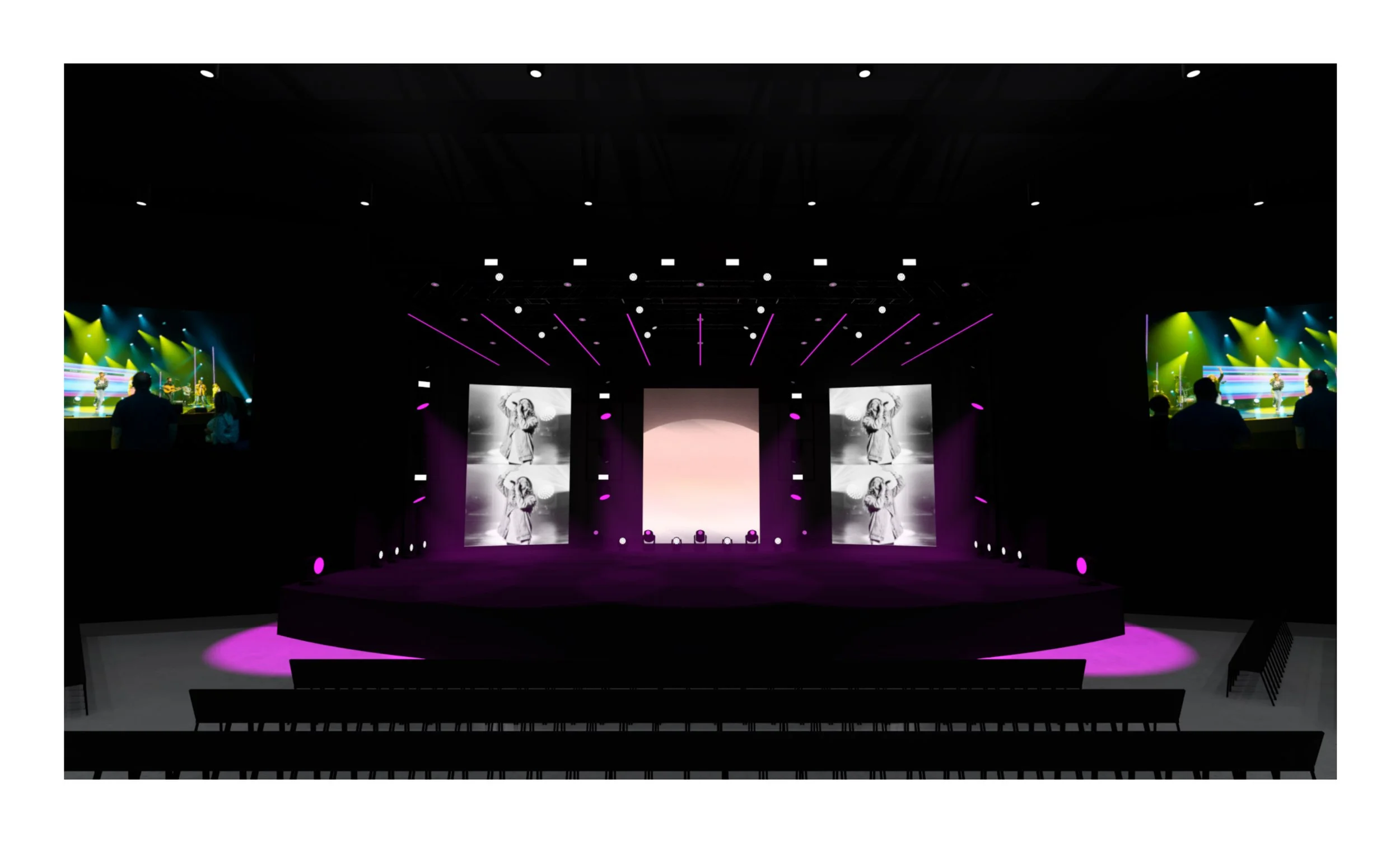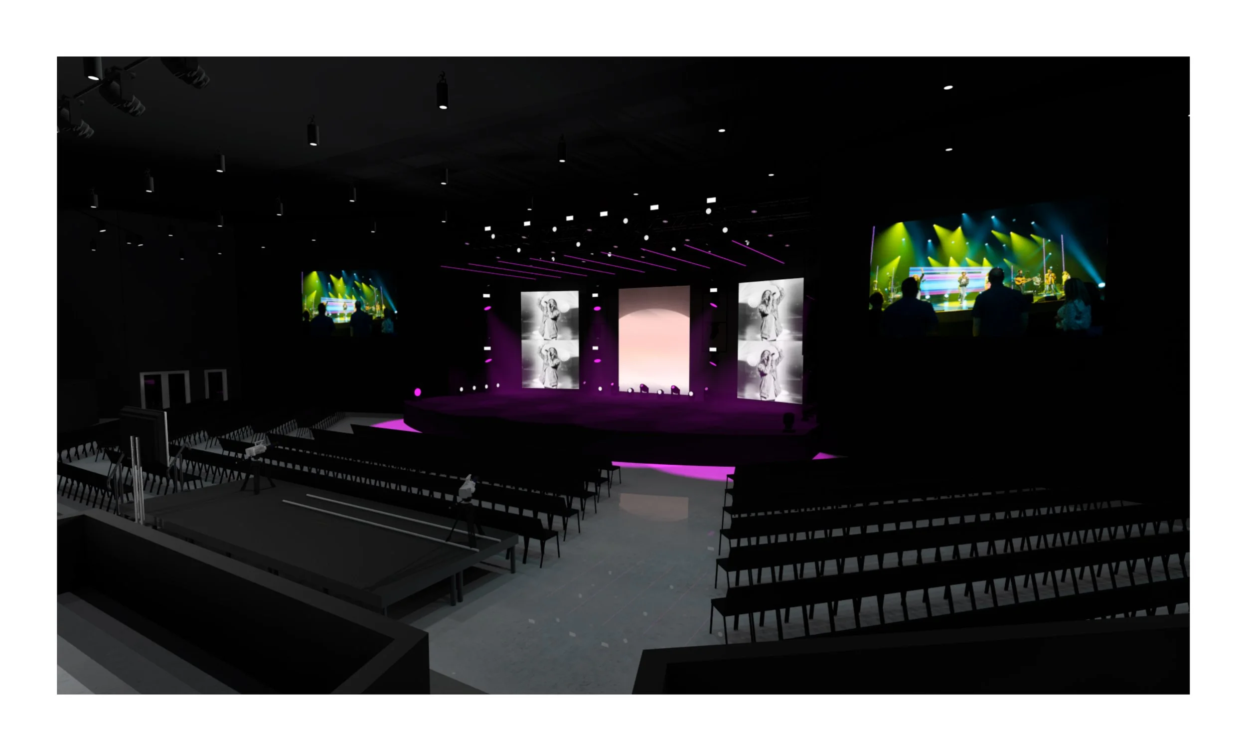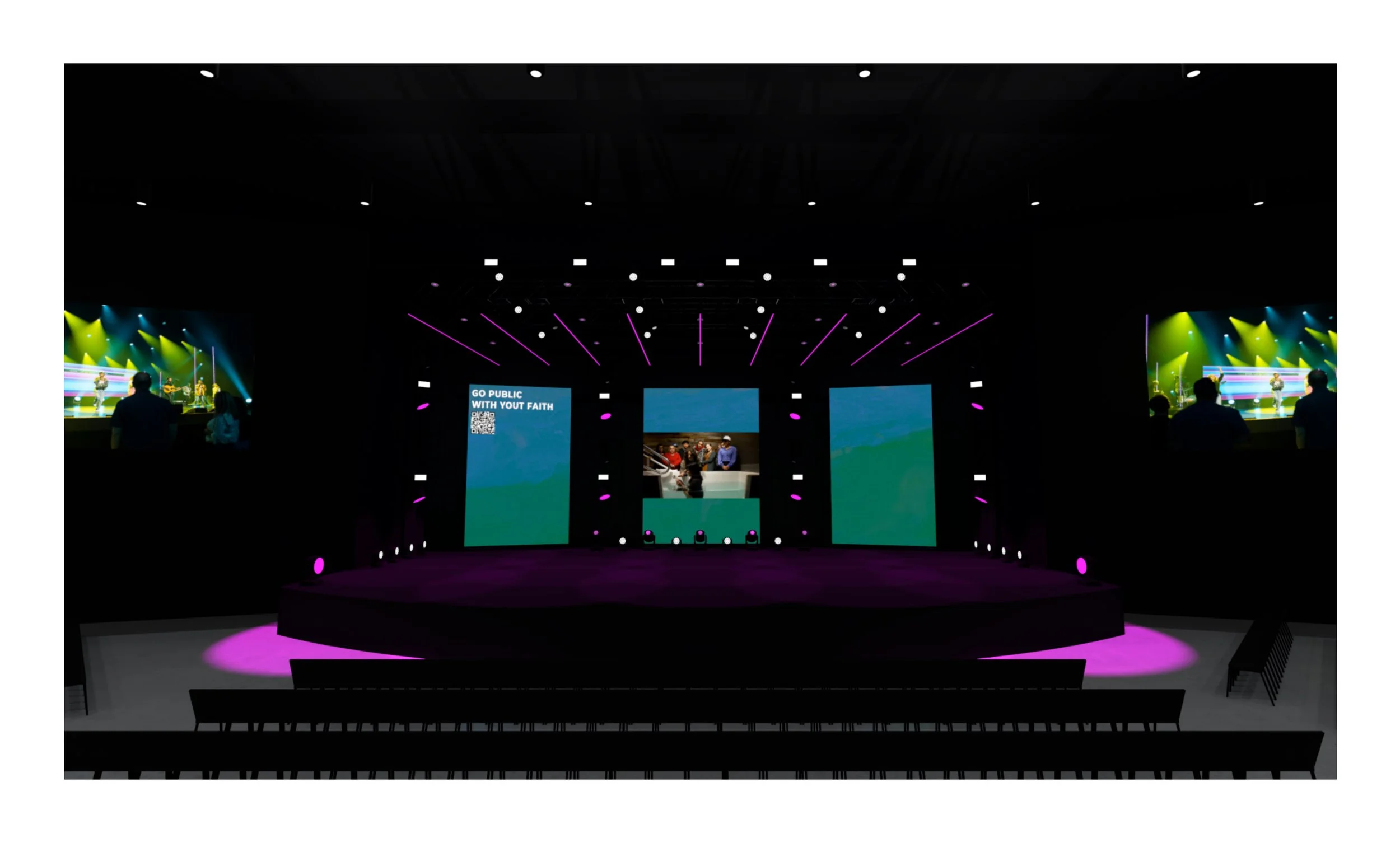 Worship could utilize screens as we normally would with stock CG, custom CG content, or at times, custom IMAG on the two angled screens.