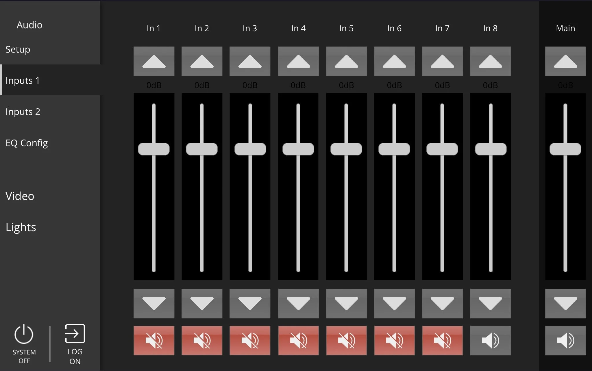 Main: This is the MASTER volume of the room, turning this fader down will turn down ALL of the volume.