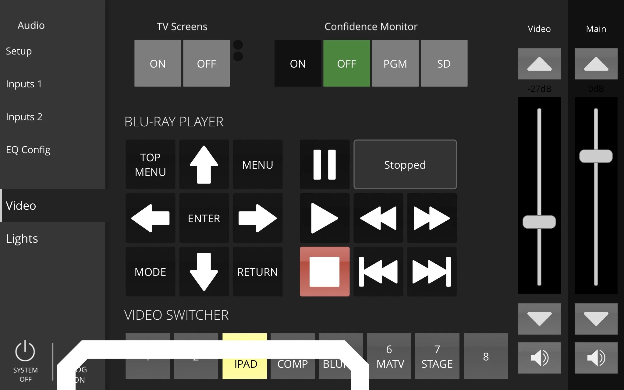 The video control in the room is accessed under the "Video" tab. This tab allows you to swap between the different sources connected, turn the TVs on and off, control blu-ray player, and adjust volume of video.