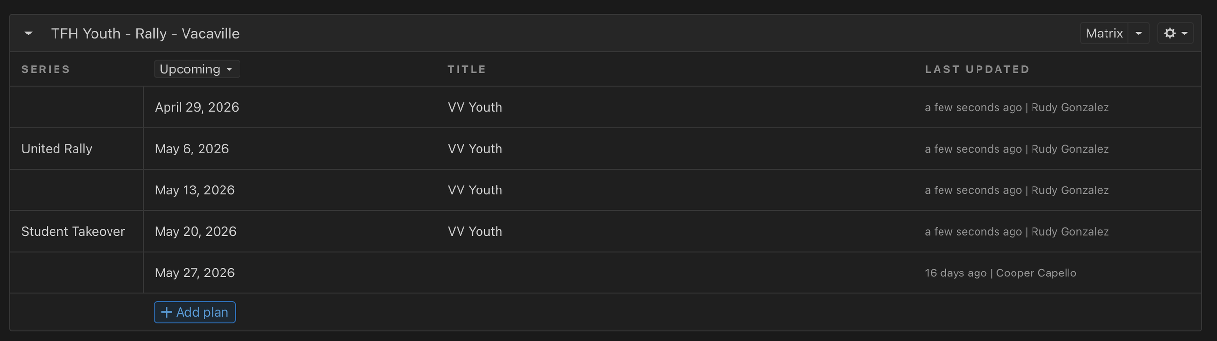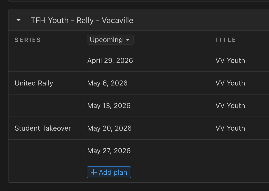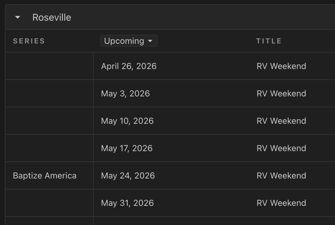 There will be times where we want to note special dates in PCO, (i.e. Baptize America, United Rally, Student Takeover). These will be in the “Series Title)